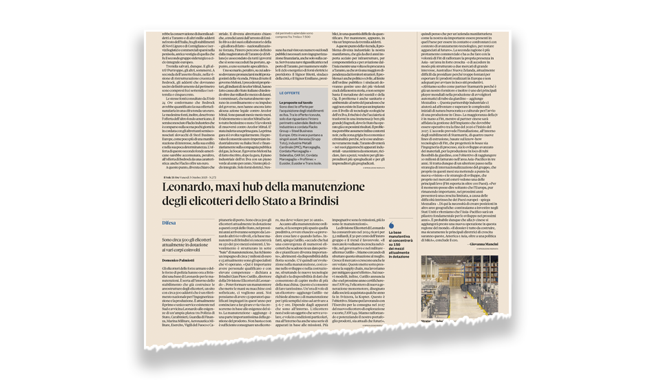 Cutting-edge structures and specialised skills, with investments in innovation and maintenance technician training. These are the pillars of the new hub for the maintenance of Italian state-owned helicopters, inaugurated at the Leonardo site in Brindisi.